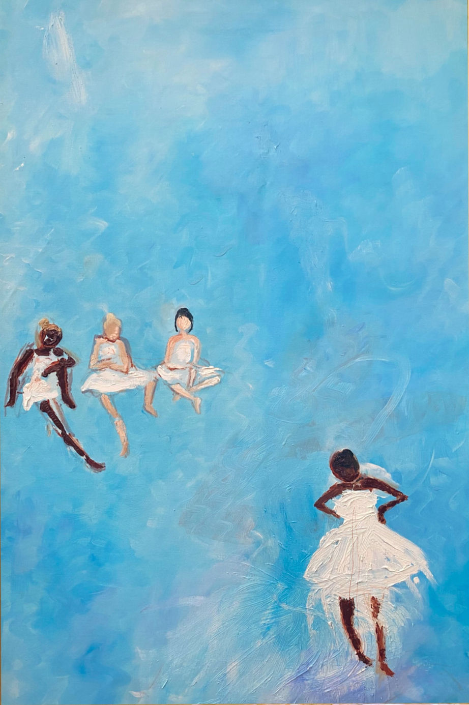 "Peer Review" (Oil & thread on canvas) reflects social dynamics and the affect of heirarichal structure on social dynamics.